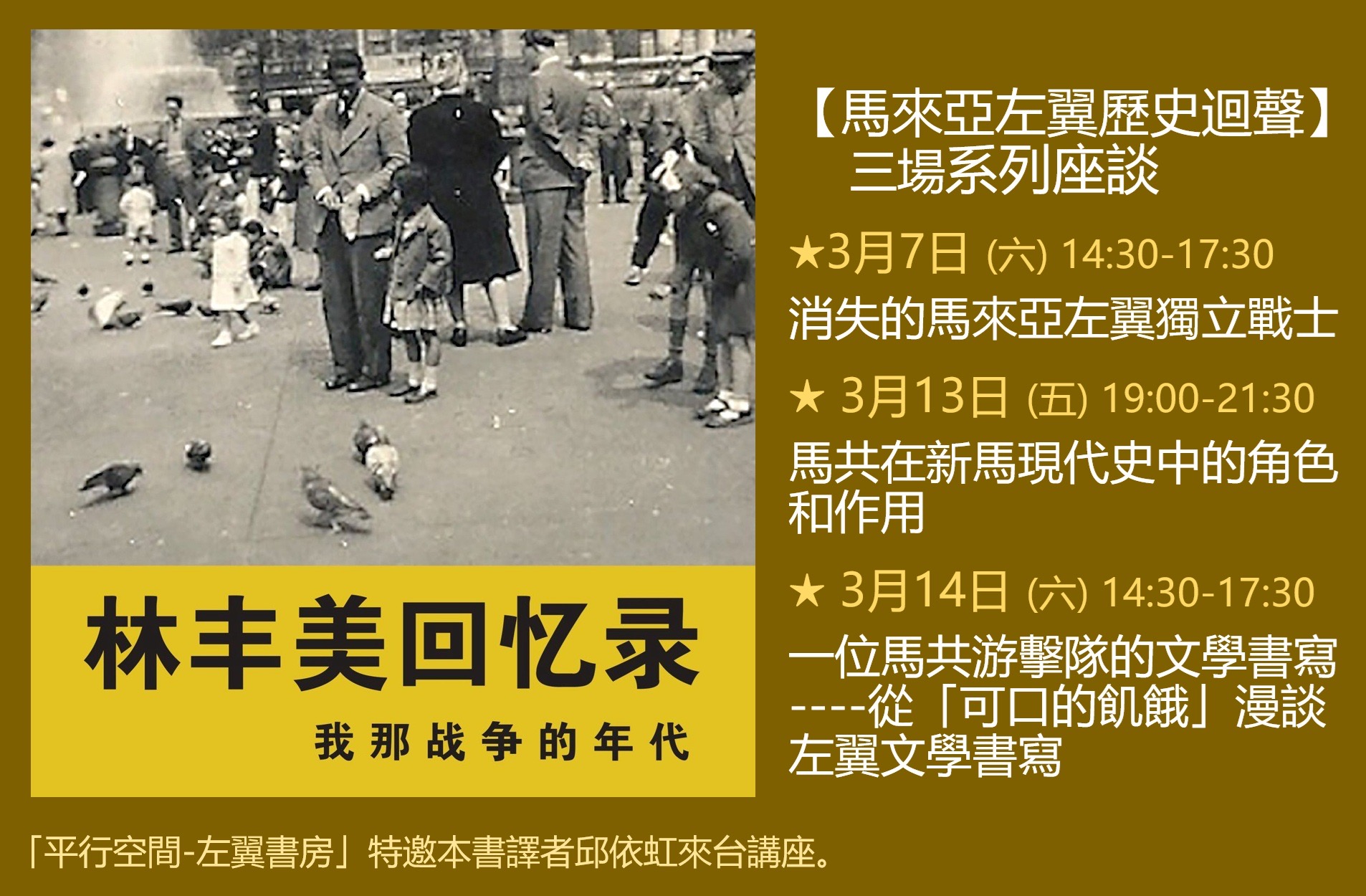 活動1:消失的馬來亞左翼獨立戰士 時間: 2026年3月7日 (六) 14:30-17:30 地點:平行空間-左翼書房 台北市文山區景興路218-1號 (捷運景美站2號出口) 活動說明:生於新加坡、白色恐怖家庭出身的邱依虹 (Agnes Khoo),翻譯了馬來西亞《林豐美回憶錄:我那戰爭的年代》,去年由馬來西亞非常獨特的左翼進步思想出版社「策略資訊研究中心(SIRD)」出版,「平行空間-左翼書房」決定邀請邱依虹親自來台舉辦新書發表會,並規劃共三場相關議題座談。 邱依虹,一位無法用國界定位的NGO資深工作者、作家、學者、移工運動者、蛋雞小農。她曾經旅居新加坡、香港、台北、孟加拉、英國、韓國、迦納、深圳、荷蘭…..。她的第一本著作是用英文寫成、後來翻譯為中文的馬共前女性游擊隊員的口述歷史《生命如河流》,這也是最早以女性觀點建構馬共歷史的專書。 第一場(3/7)座談由邱依虹介紹《林豐美回憶錄》的歷史重要性,林豐美1917年生於馬來亞基督教家庭,受英語教育成長,獲得英女皇獎學金成立以來的最高分的學霸,於1937年進入英國劍橋大學,赴英國不久就投身於為中國抗戰募款的運動中。 太平洋戰爭爆發前夕,他回到新加坡,被日本殖民政權遷移到柔佛州安置區時,秘密接觸左派「馬來亞人民抗日軍」,促成「星華義勇軍」建立。戰後,又和馬共的伍天旺共同創建《馬來亞民主同盟》(MDU),並任第一屆秘書長。1946年底他再次赴英,為馬來亞爭取脫離英國殖民、獨立自主。 1954年他在倫敦召開的各英國殖民地共產黨大會上,代馬共宣讀一份聲明,透露了可以用談判來解決1948年宣佈「緊急狀態」造成的武裝衝突,間接促成了馬共和聯邦政府和馬共在1955年底的《華林會談》。 林豐美在韓戰爆發後,以記者身分據實報導真相,並採訪了中共的彭德懷將軍,回到英國後就被吊銷英國護照,從此成為無法離境的半軟禁狀態,也無法參予1950年代之後的馬來亞政治活動,1995年於英國小鎮離世。 ========系列三場活動分別為: ★3月7日 (六) 14:30-17:30 消失的馬來亞左翼獨立戰士 ★ 3月13日 (五) 19:00-21:30 馬共在新馬現代史中的角色和作用 ★ 3月14日 (六) 14:30-17:30 一位馬共游擊隊的文學書寫—- 從「可口的飢餓」漫談左翼文學書寫 主辦:「平行空間-左翼書房」 協辦:新國際理論與實踐中心、海潮智庫