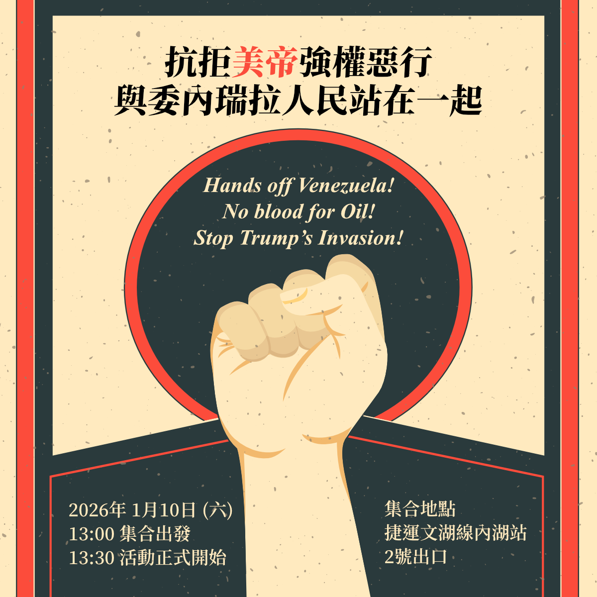 2026年1月3日,美國軍隊侵門踏戶,轟炸委內瑞拉首府,並強行綁架馬杜羅總統夫婦。1月4日起,全球各大城市掀起反美帝侵略、反強權惡行的抗議浪潮。